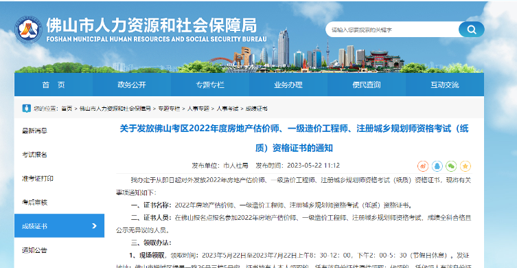 廣東佛山關(guān)于發(fā)放2022年度一級造價工程師專業(yè)技術(shù)資格證書的通知