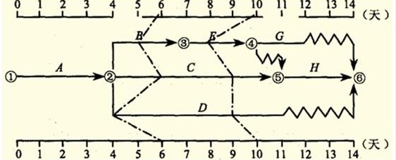 分部工程雙代號時(shí)標(biāo)網(wǎng)絡(luò)計(jì)劃執(zhí)行到第6天和第10天結(jié)束時(shí),檢查其實(shí)際進(jìn)度如下圖前鋒線所示,檢查結(jié)果表明(  )