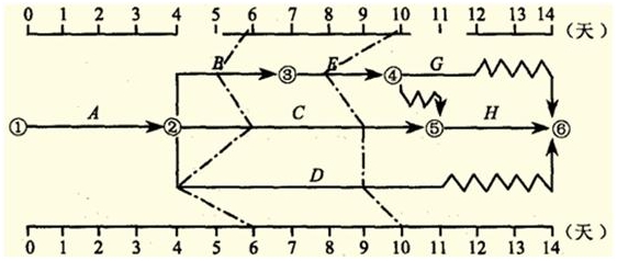 某分部工程雙代號時(shí)標(biāo)網(wǎng)絡(luò)計(jì)劃執(zhí)行到第6天和第10天結(jié)束時(shí),檢查其實(shí)際進(jìn)度如下圖前鋒線所示,檢查結(jié)果表明(   )。