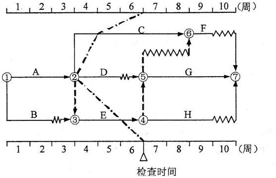 某工程雙代號時(shí)標(biāo)網(wǎng)絡(luò)計(jì)劃如下圖所示,根據(jù)第6周末實(shí)際進(jìn)度檢查結(jié)果繪制的前鋒線如點(diǎn)劃線所示。通過比較可以看出(   )。