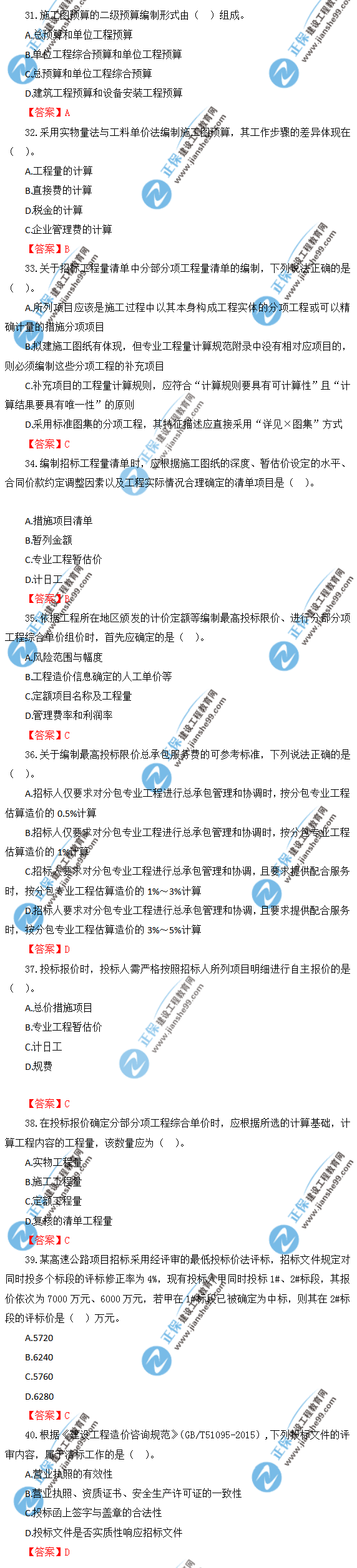 2019年一級(jí)造價(jià)師《建設(shè)工程計(jì)價(jià)》試題及答案解析31-40