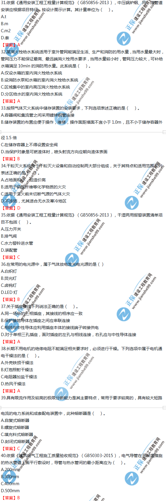以上就是為大家分享的2019年一級造價師《技術與計量(安裝)》試題及答案解析31-40,建設工程教育網將持續(xù)關注2020年一級造價師考試的相關信息。更多2020年一級造價師考試內容,盡在建設工程教育網一級造價師欄目!