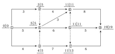 答案解析:本題考查的是節(jié)點法。工作1-3為非關鍵工作;工作2-6的總時差為11-3-4=4;工作7-8的自由時差為19-11-6=2。參見教材P127~P128。