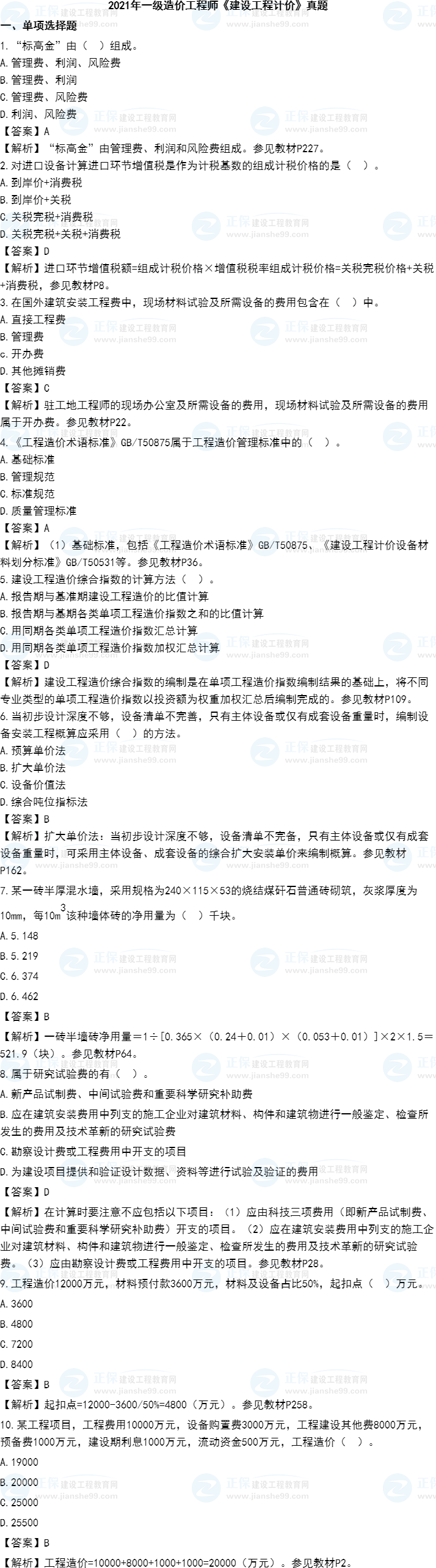 2021年一級造價師《建設(shè)工程計價》試題答案及解析1-10