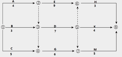 『答案解析』本題考查的是網(wǎng)絡(luò)圖的繪制。關(guān)鍵線路是AEH、ADM、CGM。參見教材P118。