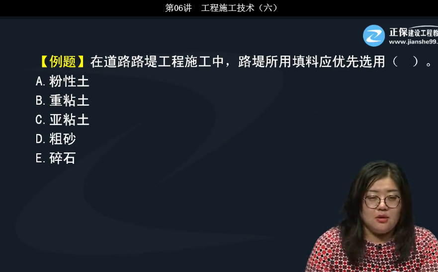 【答案解析】本題考查的是路基施工。一般情況下,碎石、卵石、礫石、粗砂等具有良好透水性,且強度高、穩(wěn)定性好,因此可優(yōu)先采用。亞砂土、亞黏土等經(jīng)壓實后也具有足夠的強度,故也可采用。粉性土水穩(wěn)定性差,不宜作路堤填料。重黏土、黏性土、搗碎后的植物土等由于透水性差,作路堤填料時應(yīng)慎重采用。