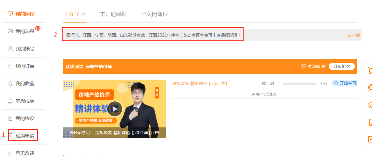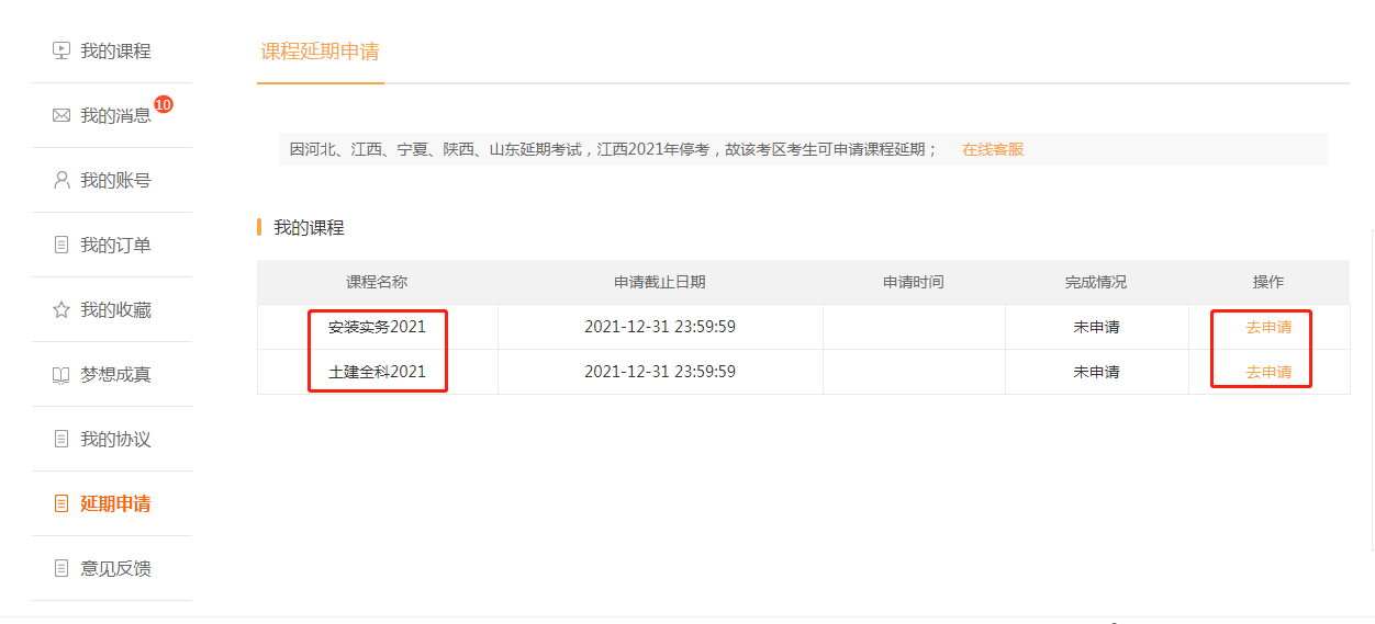 1.電腦登錄“建設(shè)工程教育網(wǎng)”進(jìn)入“我的網(wǎng)校我的家”,直接點(diǎn)擊課程上方延期說(shuō)明中的“去申請(qǐng)”