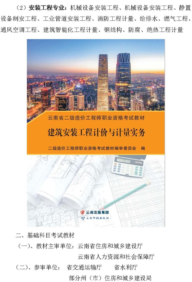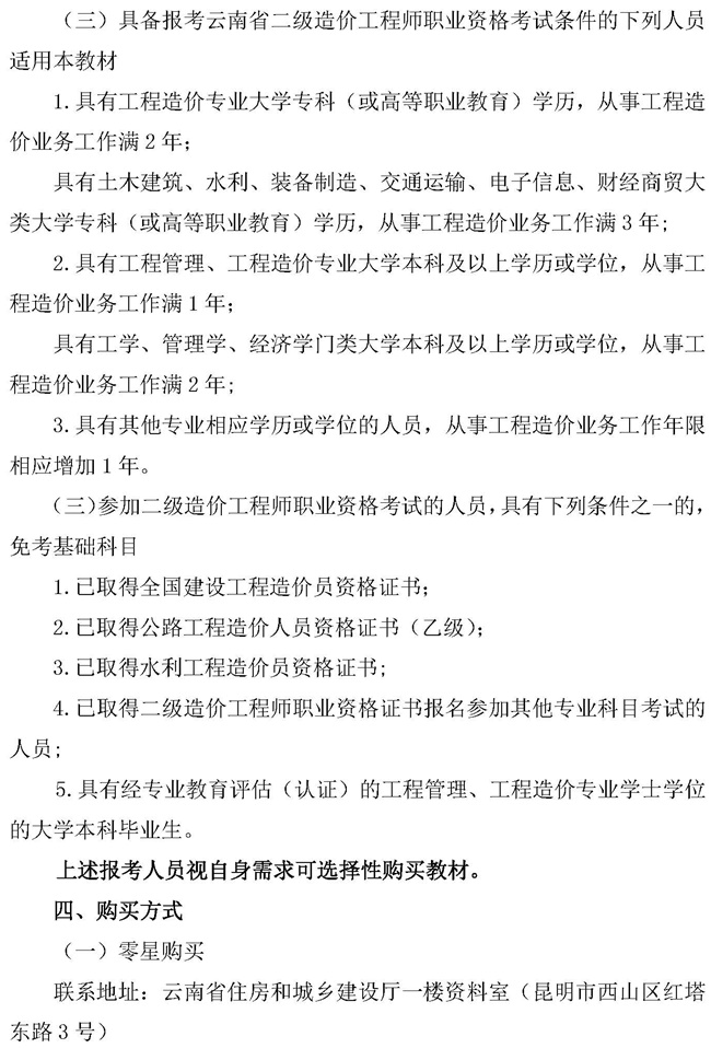 注:報考土建專業(yè)的人員可征訂和購置基礎知識和配套習題集、土木建筑工程計量與計價實務和配套習題集用書;報考安裝專業(yè)的人員可征訂和購置基礎知識和配套習題集、安裝工程計量與計價實務和配套習題集用書;符合免考條件的報考人員可不征訂和購置基礎知識和配套習題集。