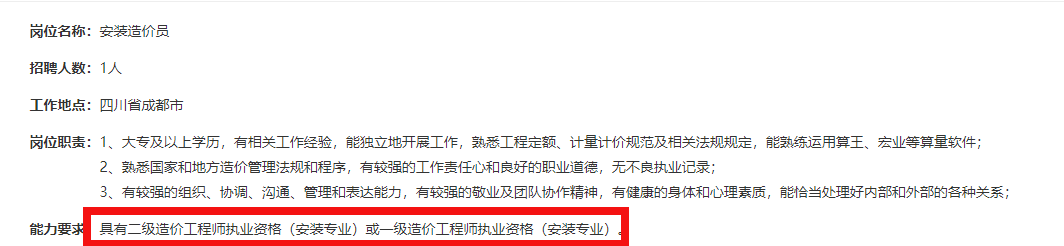 某公司招聘安裝造價員,具有二級造價工程師執(zhí)業(yè)資格優(yōu)先!