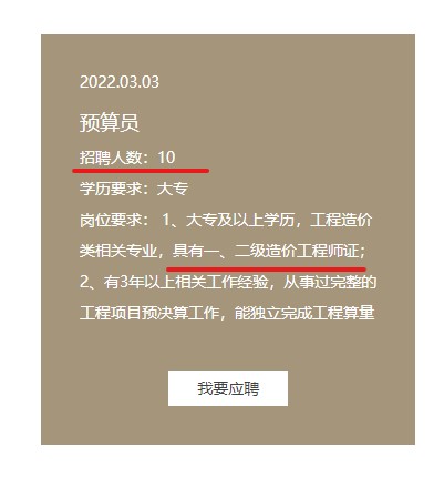 某大型建筑公司招聘多個(gè)崗位,要求持有二級造價(jià)工程師證!