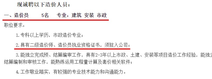 某公司招聘多名造價(jià)員,要求具有二級造價(jià)師資格!