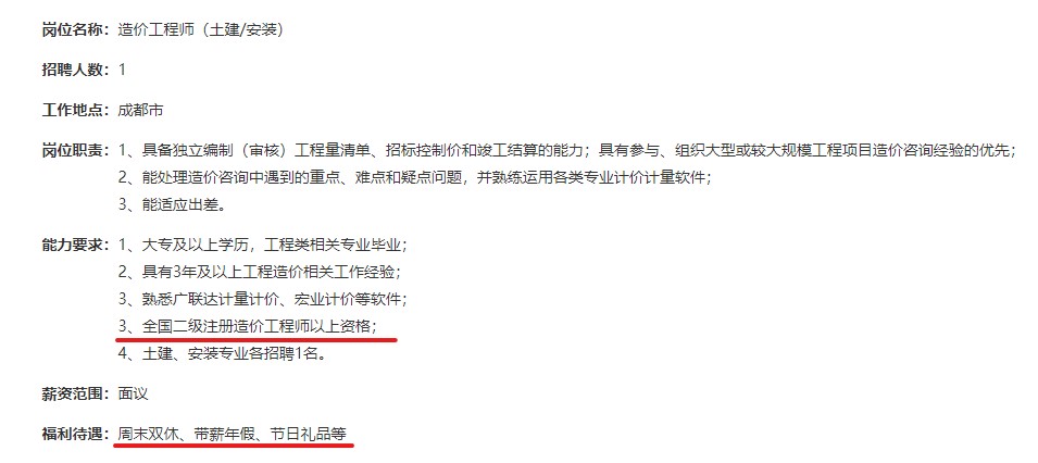 雖然說(shuō)二造難度比一造小,但是咱們含金量也不低。近日,四川某大型工程咨詢公司在四川省造價(jià)工程師協(xié)會(huì)上發(fā)布了招聘信息,需要招聘土建安裝造價(jià)員,其中強(qiáng)調(diào)需要二級(jí)注冊(cè)造價(jià)工程師證書(shū)。