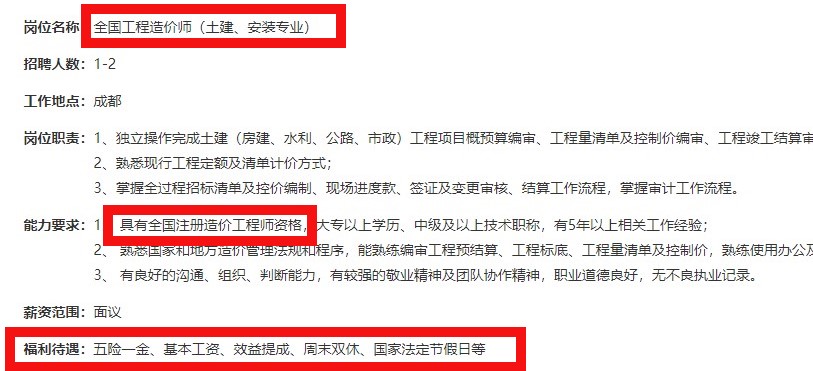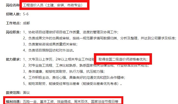 近日,四川某大型公司發(fā)布的的招聘簡(jiǎn)章也顯示,具有二級(jí)造價(jià)師證書的優(yōu)先考慮