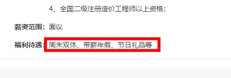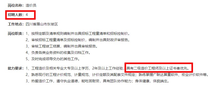 目前各工程建設(shè)公司在招聘條件中明確標(biāo)明,具有二級造價(jià)師注冊證書優(yōu)先,且福利待遇都不差。