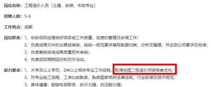 其實(shí)大部分工程都是在省內(nèi)進(jìn)行,跨省的業(yè)務(wù)比較少,二級(jí)造價(jià)師就能滿足需求。而且目前大部分企業(yè)的招聘條件上都標(biāo)明有二級(jí)造價(jià)師證書(shū)優(yōu)先。