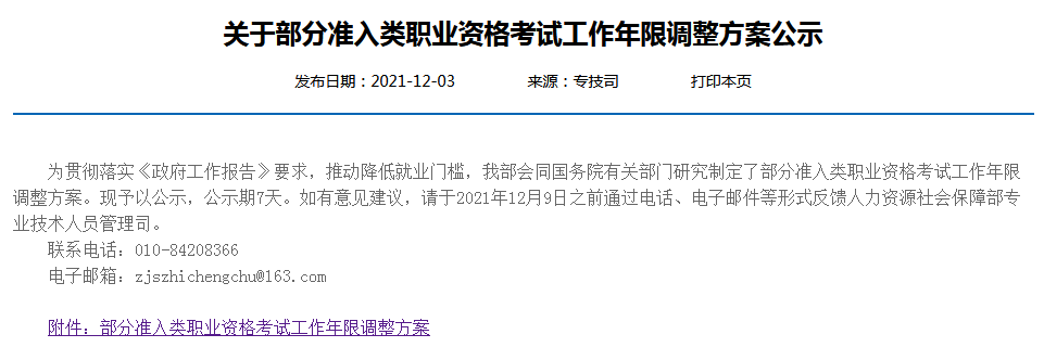 為貫徹落實(shí)《政府工作報(bào)告》要求,推動(dòng)降低就業(yè)門檻,我部會(huì)同國(guó)務(wù)院有關(guān)部門研究制定了部分準(zhǔn)入類職業(yè)資格考試工作年限調(diào)整方案?,F(xiàn)予以公示,公示期7天。如有意見建議,請(qǐng)于2021年12月9日之前通過電話、電子郵件等形式反饋人力資源社會(huì)保障部專業(yè)技術(shù)人員管理司。