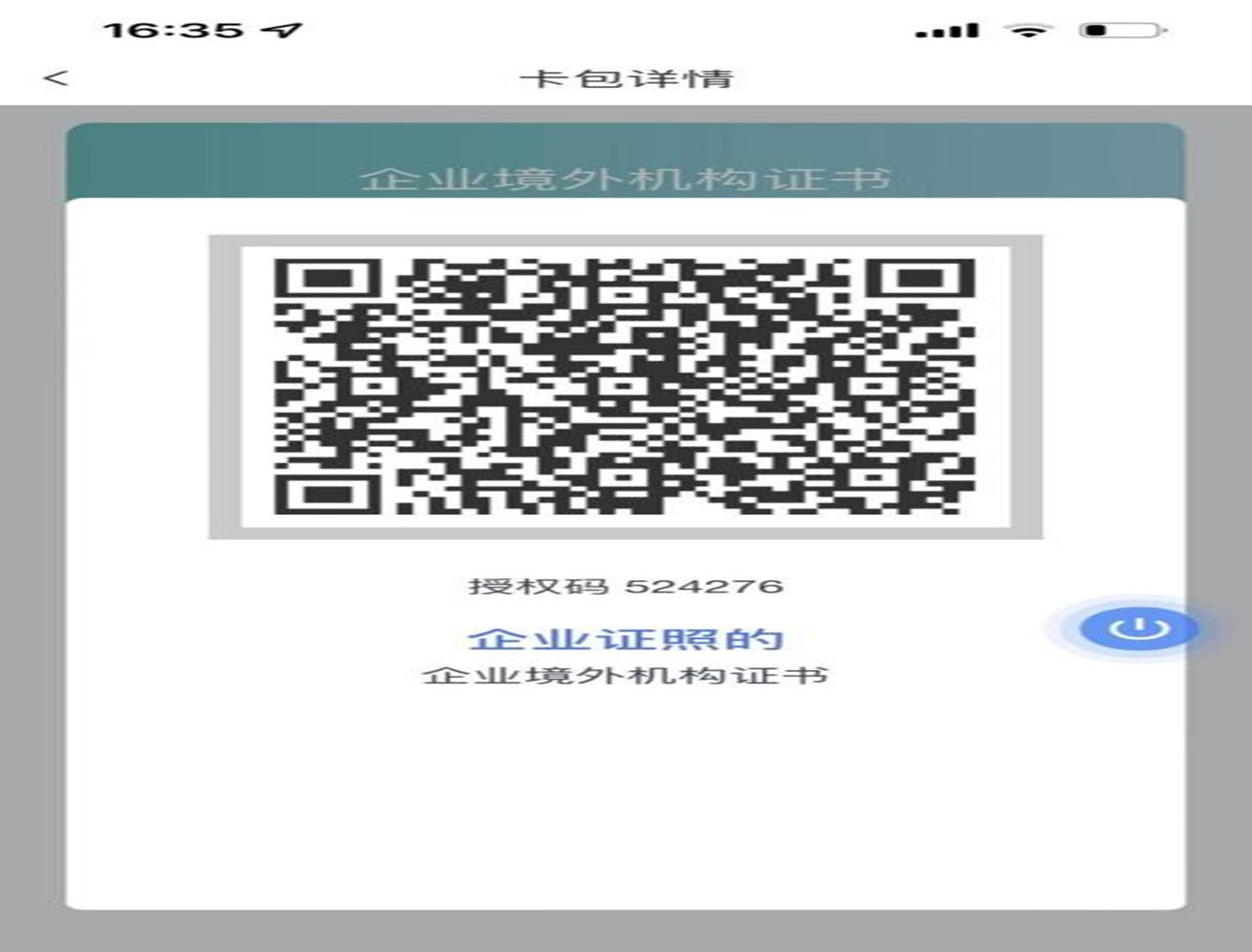 4、選擇要使用的證照,如下圖的【企業(yè)境外機(jī)構(gòu)證書】,可進(jìn)行授權(quán)、亮證、查看使用記錄、進(jìn)行電子證照下載。