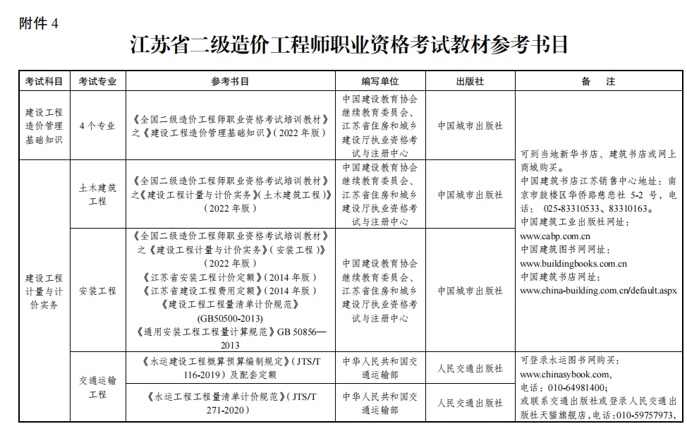 2025年江蘇省二級(jí)造價(jià)工程師職業(yè)資格考試依據(jù)住房城鄉(xiāng)建設(shè)部、交通運(yùn)輸部、水利部組織編寫,人力資源社會(huì)保障部審定的 2019 年版《全國二級(jí)造價(jià)工程師職業(yè)資格考試大綱》命題。中國建設(shè)工程造價(jià)管理協(xié)會(huì)網(wǎng)站(http://www.ccea.pro)、交通運(yùn)輸部職業(yè)資格中心網(wǎng)站(http://www.jtzyzg.org.cn)及水利水電規(guī)劃設(shè)計(jì)總院網(wǎng)站(http://www.giwp.org.cn)可免費(fèi)下載。參考教材詳見附件 4。