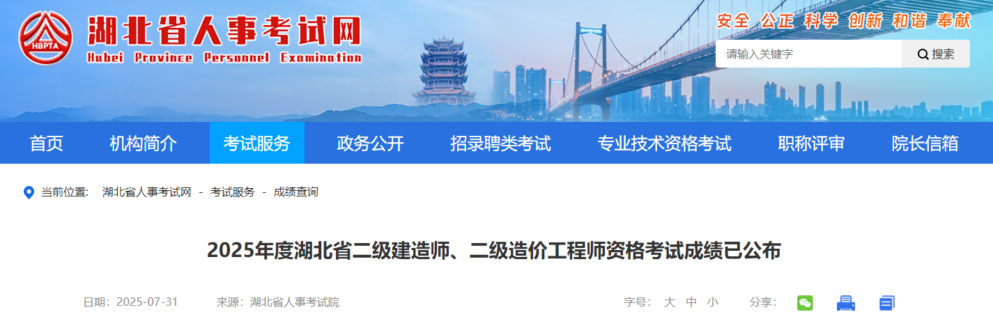 2025年度湖北省二級造價工程師資格考試成績于2025年7月31日公布,請考生到湖北人事考試網(wǎng)“成績查詢”欄目進行查詢。官方通知如下: