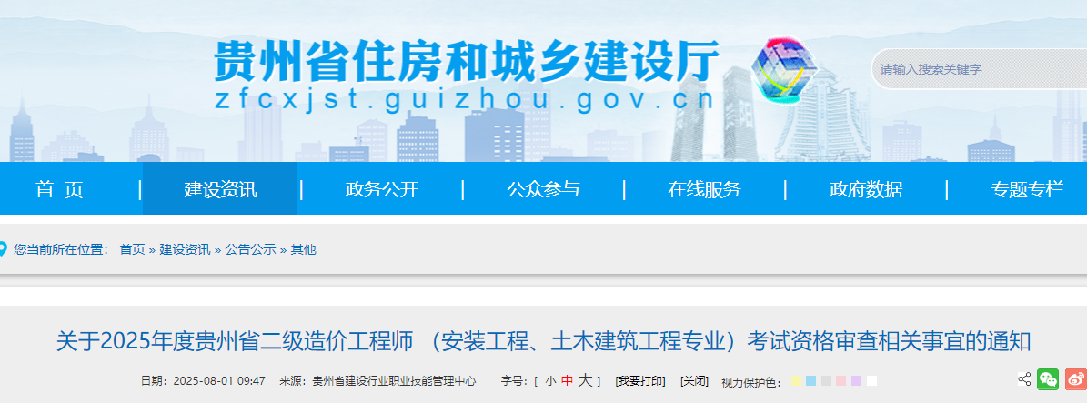 關于2025年度貴州省二級造價工程師(安裝工程、土木建筑工程專業(yè))考試資格審查相關事宜的通知