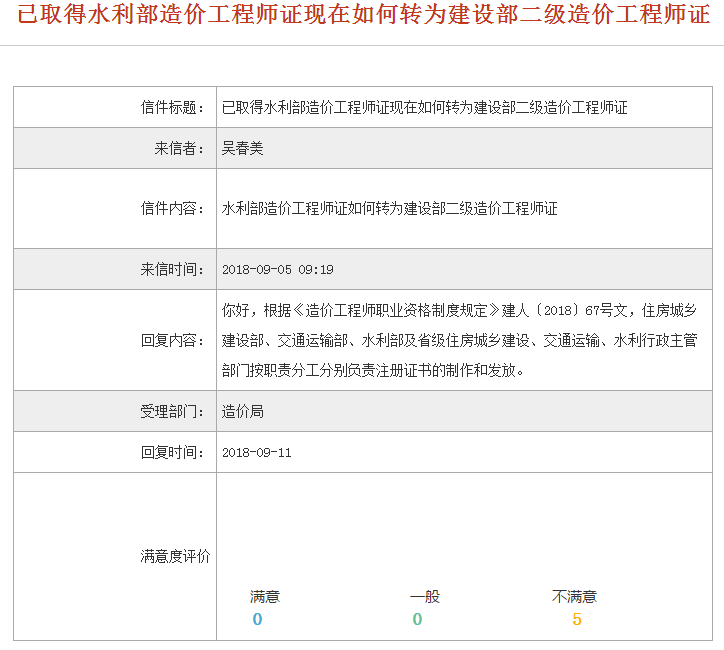 網(wǎng)友提問(wèn):已取得水利部造價(jià)工程師證現(xiàn)在如何轉(zhuǎn)為建設(shè)部二級(jí)造價(jià)工程師證?