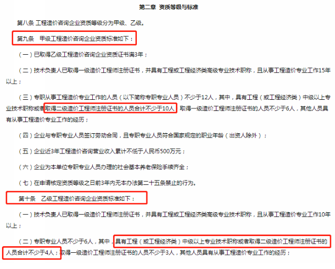 根據(jù)住房和城鄉(xiāng)建設(shè)部關(guān)于修改《工程造價(jià)咨詢企業(yè)管理辦法》《注冊造價(jià)工程師管理辦法》的決定,其中首次明確了在認(rèn)定造價(jià)咨詢企業(yè)資質(zhì)時(shí)二級造價(jià)工程師同等于中級職稱。