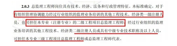 中國建設(shè)監(jiān)理協(xié)會頒布的《項(xiàng)目監(jiān)理機(jī)構(gòu)人員配置標(biāo)準(zhǔn)》(試行),明確一級類注冊證(常見的就是一級建造師、一級造價(jià)師、安全工程師等),二級類注冊證(二級建造師、二級造價(jià)師),可以擔(dān)任總監(jiān)理工程師。