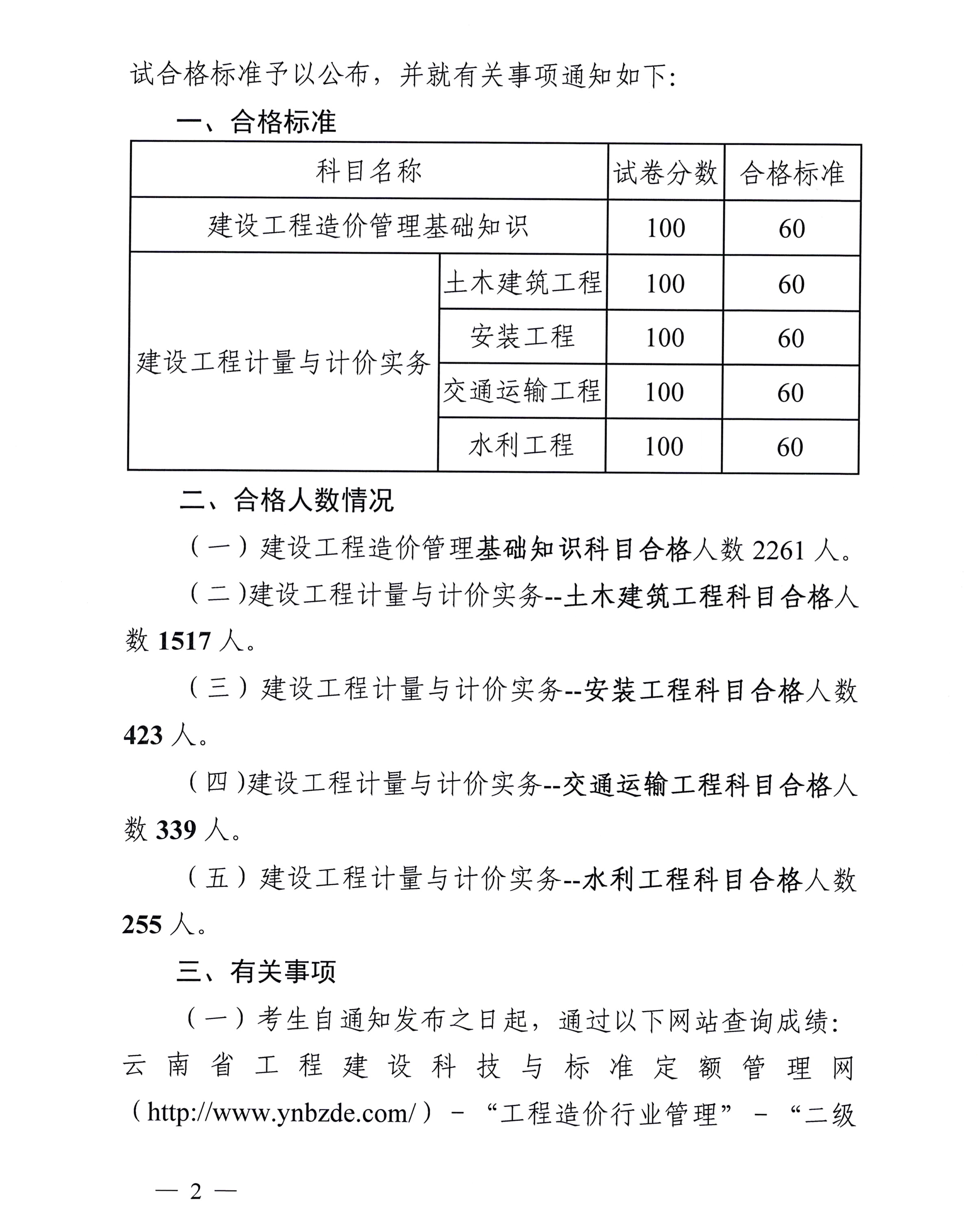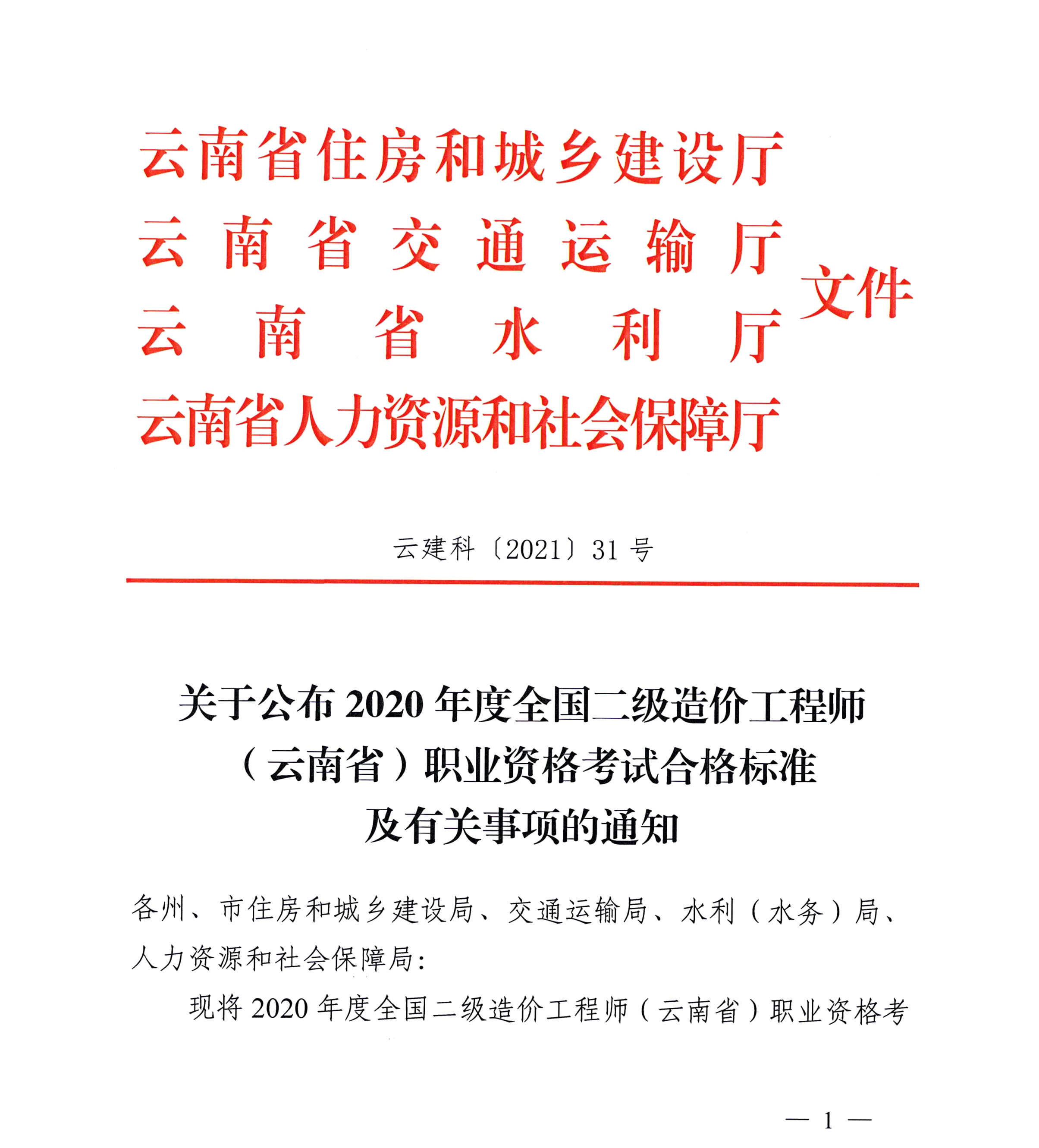關(guān)于公布2020年度全國二級造價(jià)工程師(云南省)職業(yè)資格考試合格標(biāo)準(zhǔn)及有關(guān)事項(xiàng)的通知