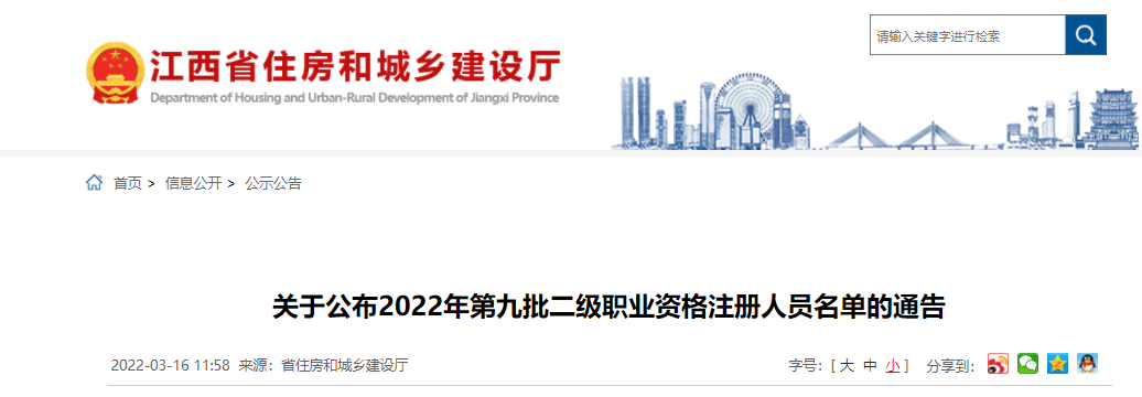 江西關(guān)于公布2022年第九批二級造價(jià)工程師職業(yè)資格注冊人員名單的通告