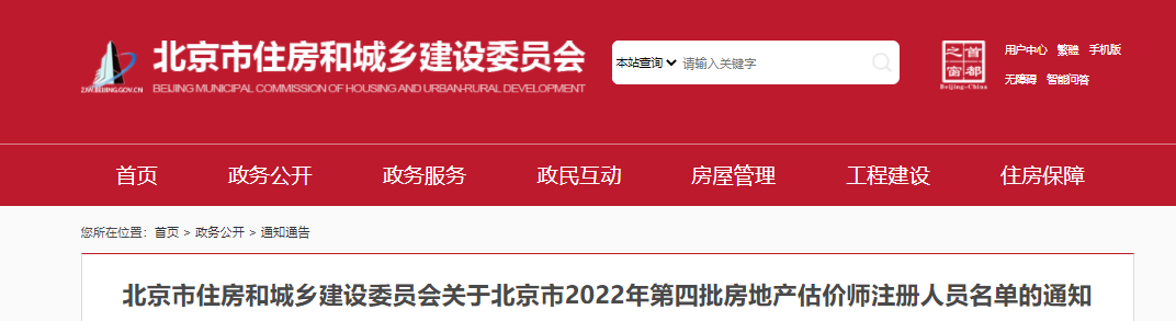 北京市住房和城鄉(xiāng)建設(shè)委員會關(guān)于北京市2022年第四批房地產(chǎn)估價師注冊人員名單的通知