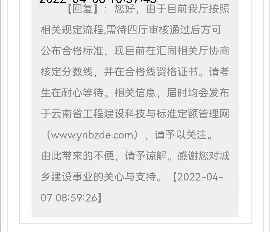 官方回復(fù):您好,由于目前我廳按照相關(guān)規(guī)定流程,需待四廳審核通過(guò)后方可公布合格標(biāo)準(zhǔn),現(xiàn)目前在匯同相關(guān)廳協(xié)商核定分?jǐn)?shù)線,并在合格線資格證書。請(qǐng)考生在耐心等待。相關(guān)信息,屆時(shí)均會(huì)發(fā)布于云南省工程建設(shè)科技于標(biāo)準(zhǔn)定額管理網(wǎng)(),請(qǐng)予以關(guān)注。由此帶來(lái)的不便,請(qǐng)于諒解。感謝您對(duì)城鄉(xiāng)建設(shè)事業(yè)的關(guān)心與支持。
