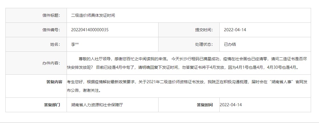 考生提問:  尊敬的人社廳領(lǐng)導(dǎo),感謝您百忙之中閱讀我的來信。 今天長沙行程碼已摘星成功,疫情在社會面也已經(jīng)清零,請問二造證書是否盡快安排發(fā)放呢? 目前已經(jīng)是4月中旬了,請明確回復(fù)下發(fā)證時間,勿答復(fù)證書將于4月發(fā)放,因為4月1號也是4月,4月30號也是4月。