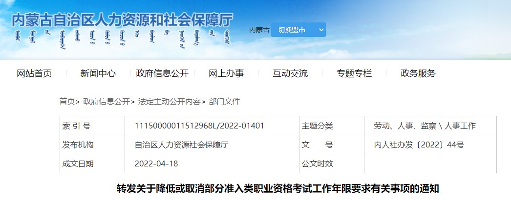 內蒙古人社廳轉發(fā)關于降低二級造價工程師考試工作年限要求有關事項通知