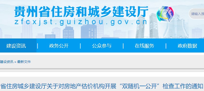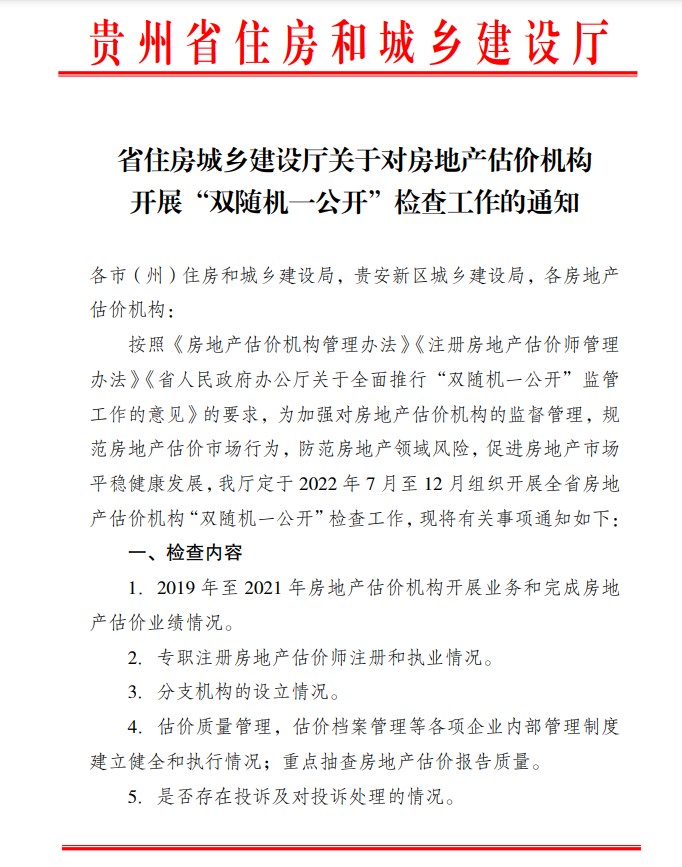 貴州省住建廳關(guān)于對房地產(chǎn)估價(jià)機(jī)構(gòu)開展“雙隨機(jī)一公開”檢查工作的通知