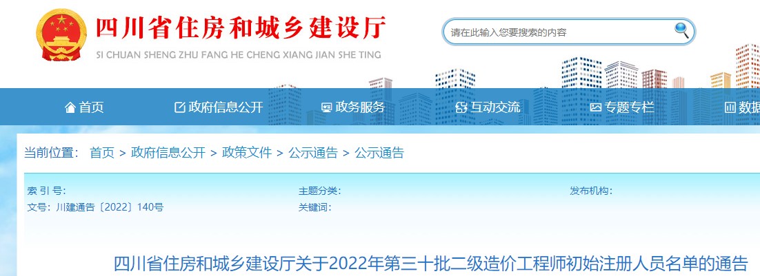 四川省住房和城鄉(xiāng)建設(shè)廳關(guān)于2022年第三十批二級造價工程師初始注冊人員名單的通告