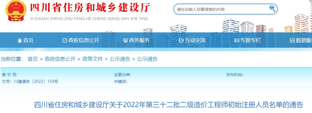 四川省住房和城鄉(xiāng)建設(shè)廳關(guān)于2022年第三十二批二級(jí)造價(jià)工程師初始注冊(cè)人員名單的通告