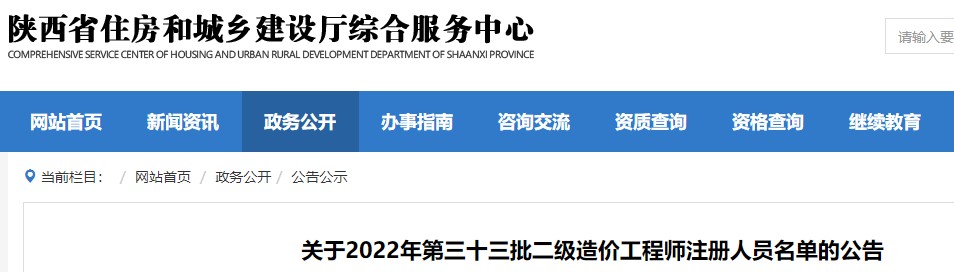 陜西?關(guān)于2022年第三十三批二級造價(jià)工程師注冊人員名單的公告