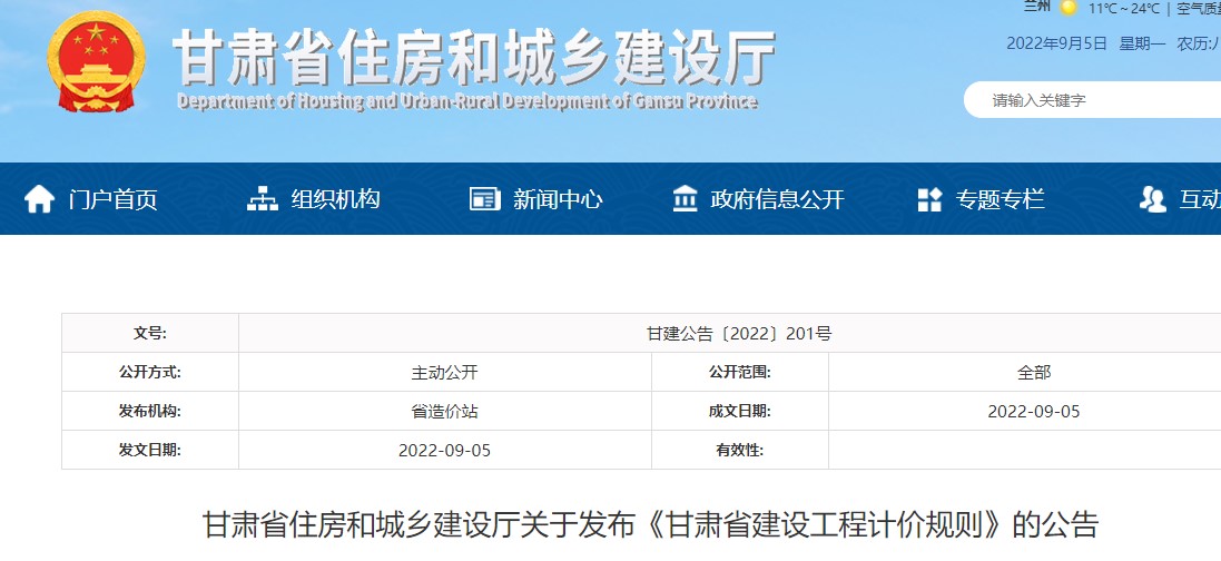 甘肅省住房和城鄉(xiāng)建設(shè)廳關(guān)于發(fā)布《甘肅省建設(shè)工程計價規(guī)則》的公告