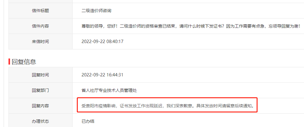 官方回復(fù):受貴陽市疫情影響,證書發(fā)放工作出現(xiàn)延遲,我們深表歉意。具體發(fā)放時間請留意后續(xù)通知。
