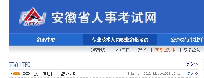 準考證打印入口:安徽省人事考試網-專業(yè)技術人員職業(yè)資格考試-準考證打印