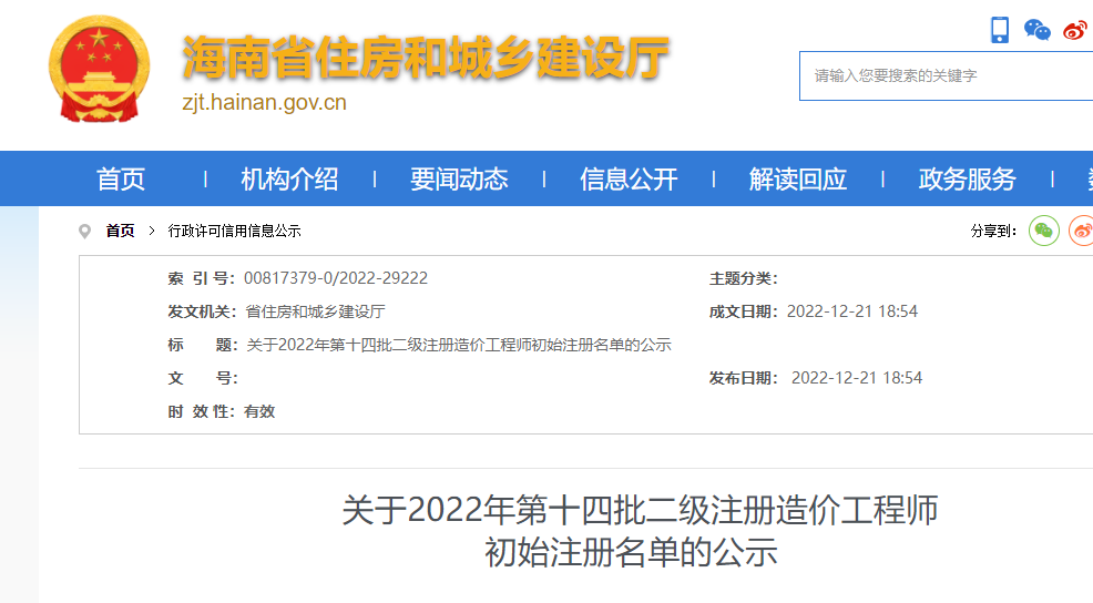 海南省?關(guān)于2022年第十四批二級注冊造價工程師初始注冊名單的公示