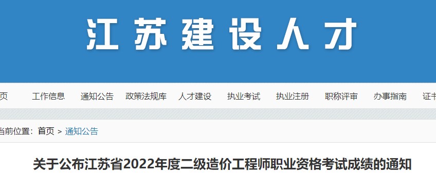 關于公布江蘇省2022年度二級造價工程師職業(yè)資格考試成績的通知