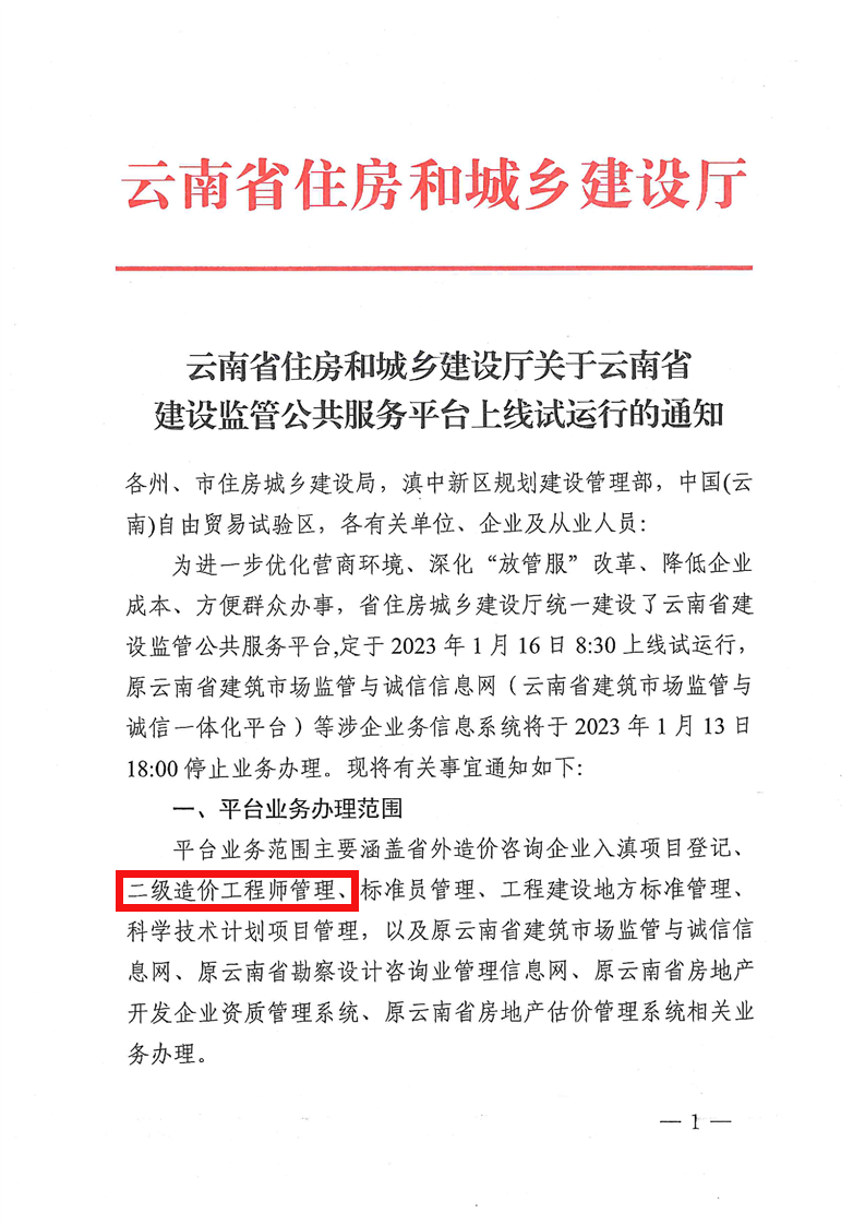 關(guān)于云南省建設(shè)監(jiān)管公共服務(wù)平臺上線試運行的通知,涉及二級造價師
