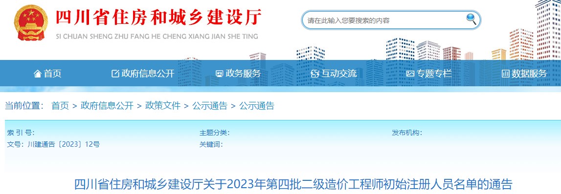 四川省住房和城鄉(xiāng)建設(shè)廳關(guān)于2023年第四批二級造價工程師初始注冊人員名單的通告