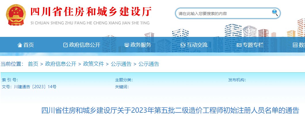 四川省住房和城鄉(xiāng)建設(shè)廳關(guān)于2023年第五批二級造價工程師初始注冊人員名單的通告