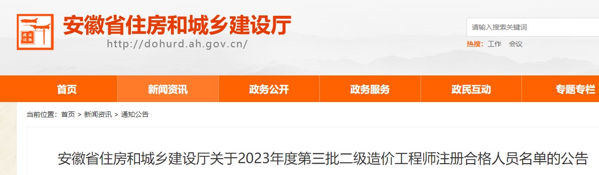 安徽省住房和城鄉(xiāng)建設(shè)廳關(guān)于2023年度第三批二級(jí)造價(jià)工程師注冊(cè)合格人員名單的公告