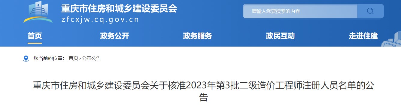 重慶市住房和城鄉(xiāng)建設(shè)委員會(huì)關(guān)于核準(zhǔn)2023年第3批二級(jí)造價(jià)工程師注冊(cè)人員名單的公告