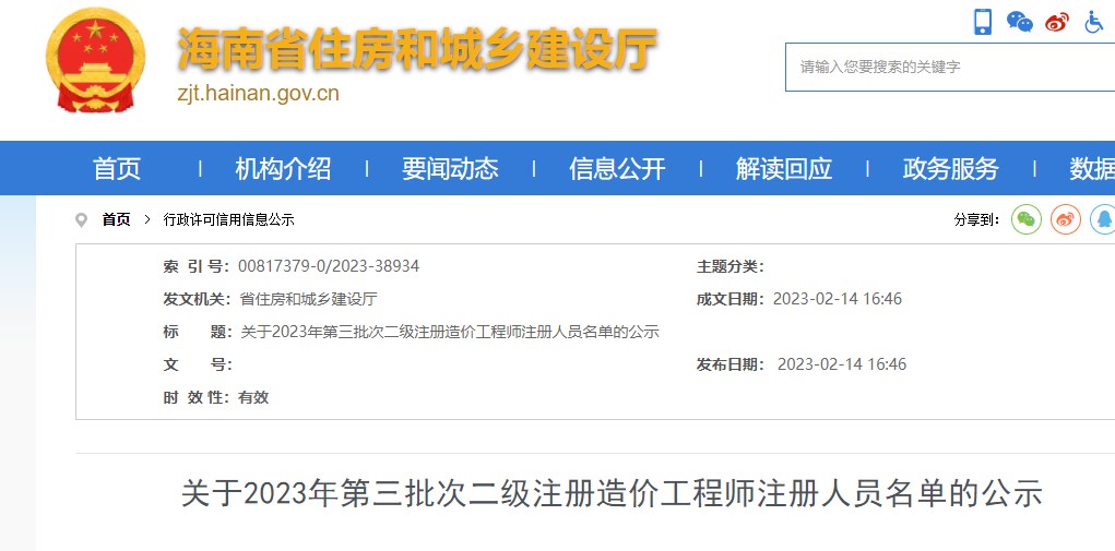 海南省關于2023年第三批次二級造價師注冊人員名單的公示
