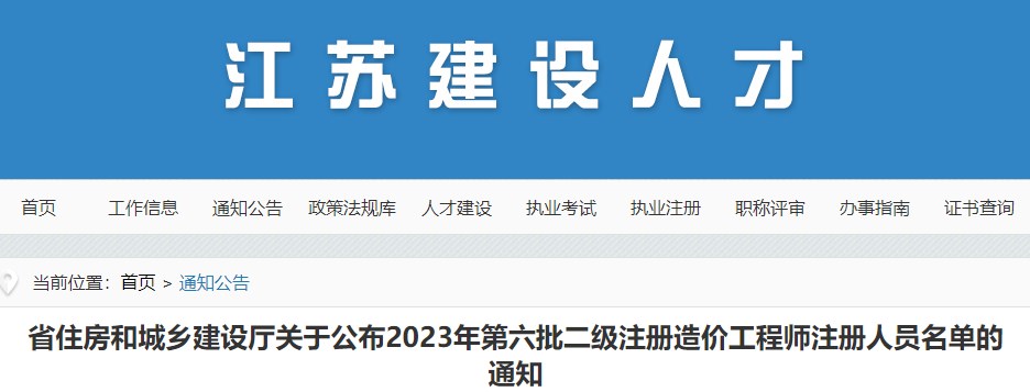 江蘇省關(guān)于公布2023年第六批二級造價師注冊人員名單的通告
