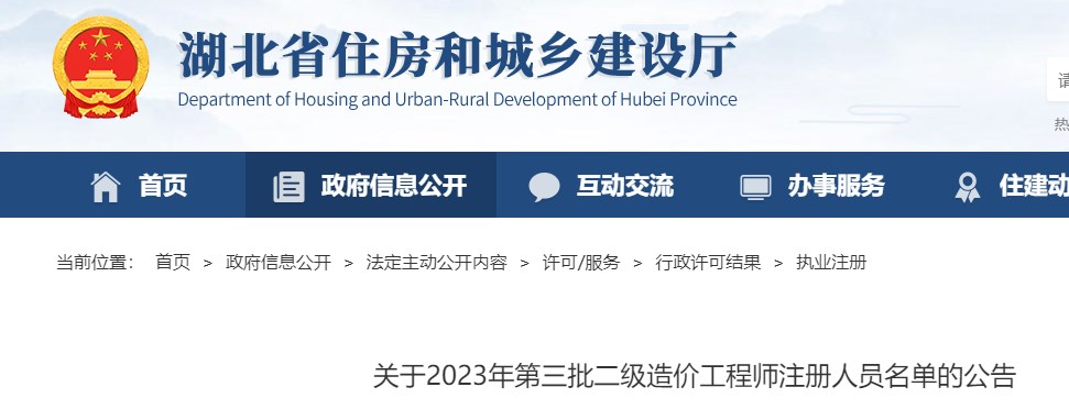 湖北省關于2023年第三批二級造價師注冊人員名單的公告